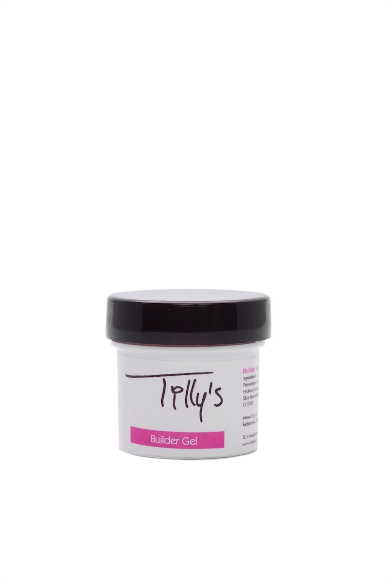 Tilly's Builder gel (fase 2). Deze zuurvrije gel geeft een mooi natuurlijk effect aan de kunstnagel. De builder gel is een dikke bouwgel. Gemakkelijk op te brengen, egaliseert zichzelf en vloeit niet uit in de nagelriemen.