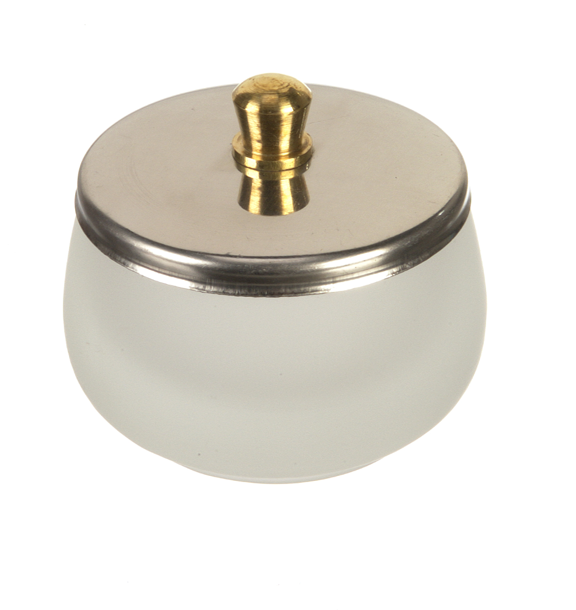 Frosteddappendish: een bakje van gezandstraald glas met een roestvrijstalen deksel, zodat je het bakje kunt afdekken