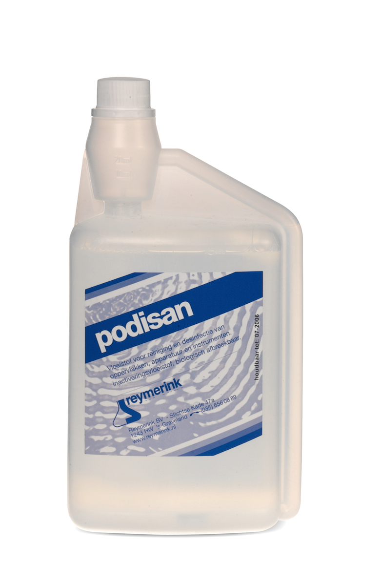 Podisan.Inactiverings- en desinfectantvloeistof. Podisan is een vloeistof voor het reinigen en desinfecteren van instrumenten en oppervlakken. Tevens geschikt voor gebruik in ultrasoon apparatuur. Leverbaar in flacons van 1000 ml.